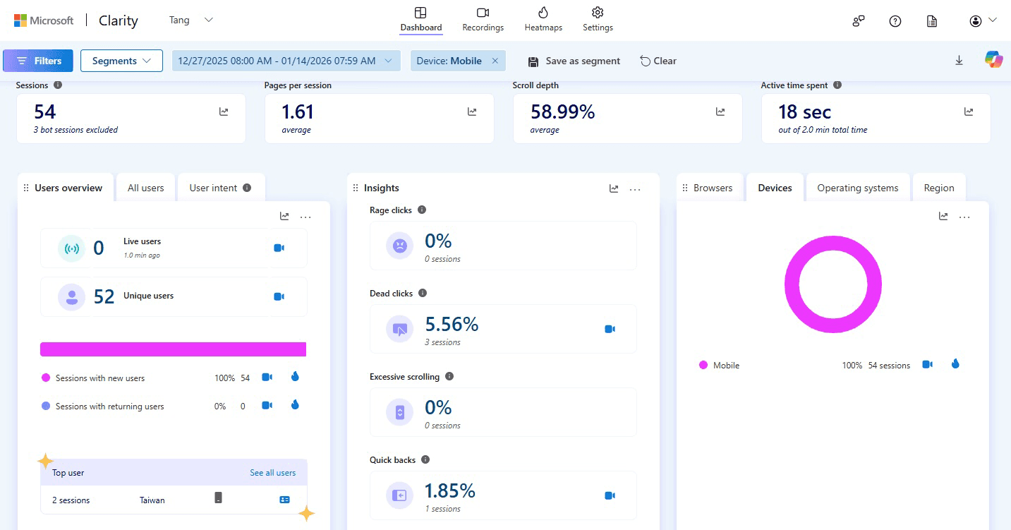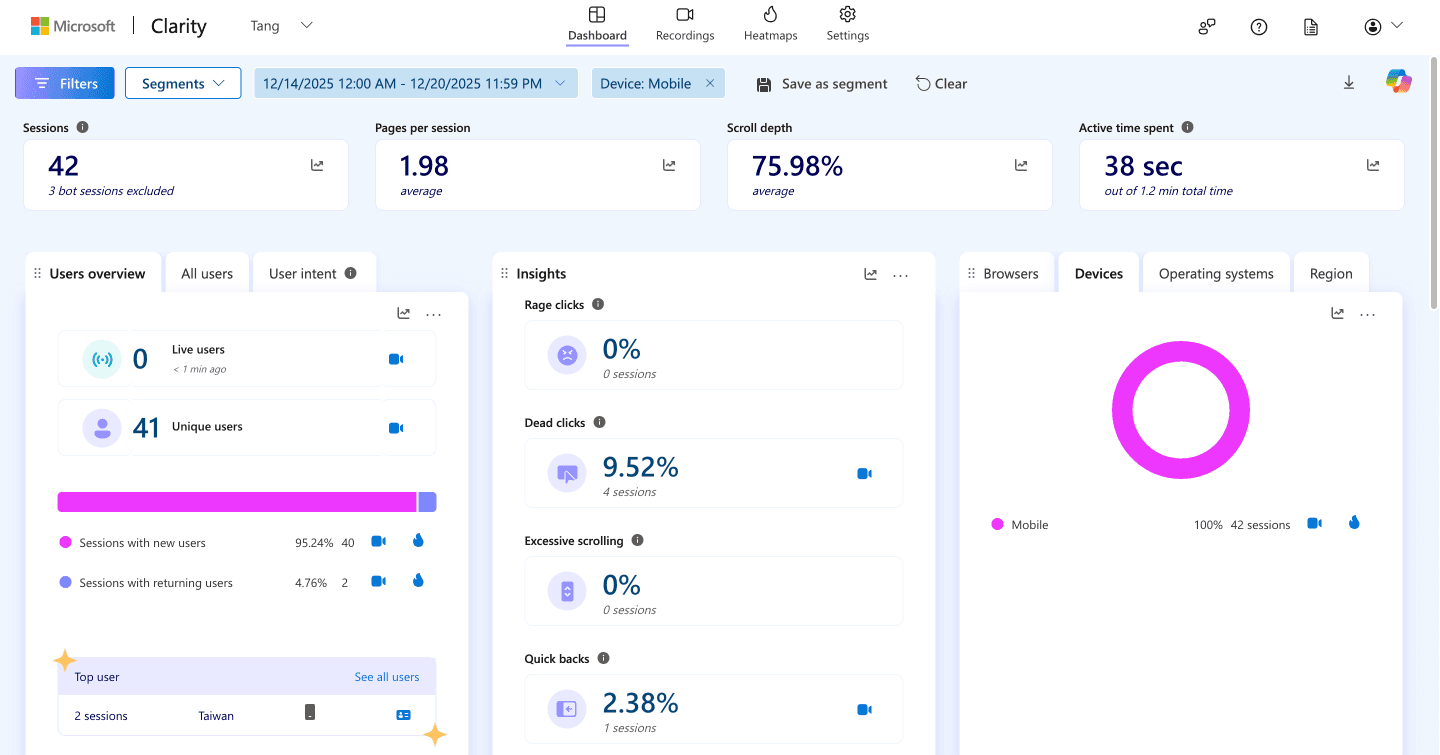 I reviewed key metrics, heatmaps, and session recordings to understand where and how the dead clicks occurred. After segmenting users by device, I found that 75% of sessions came from mobile users, with a 9.52% dead click rate, while desktop users showed no dead clicks. Session recordings revealed that a non-functional menu item was the primary cause.