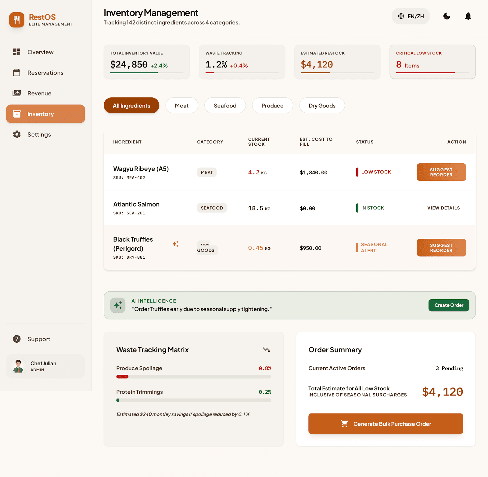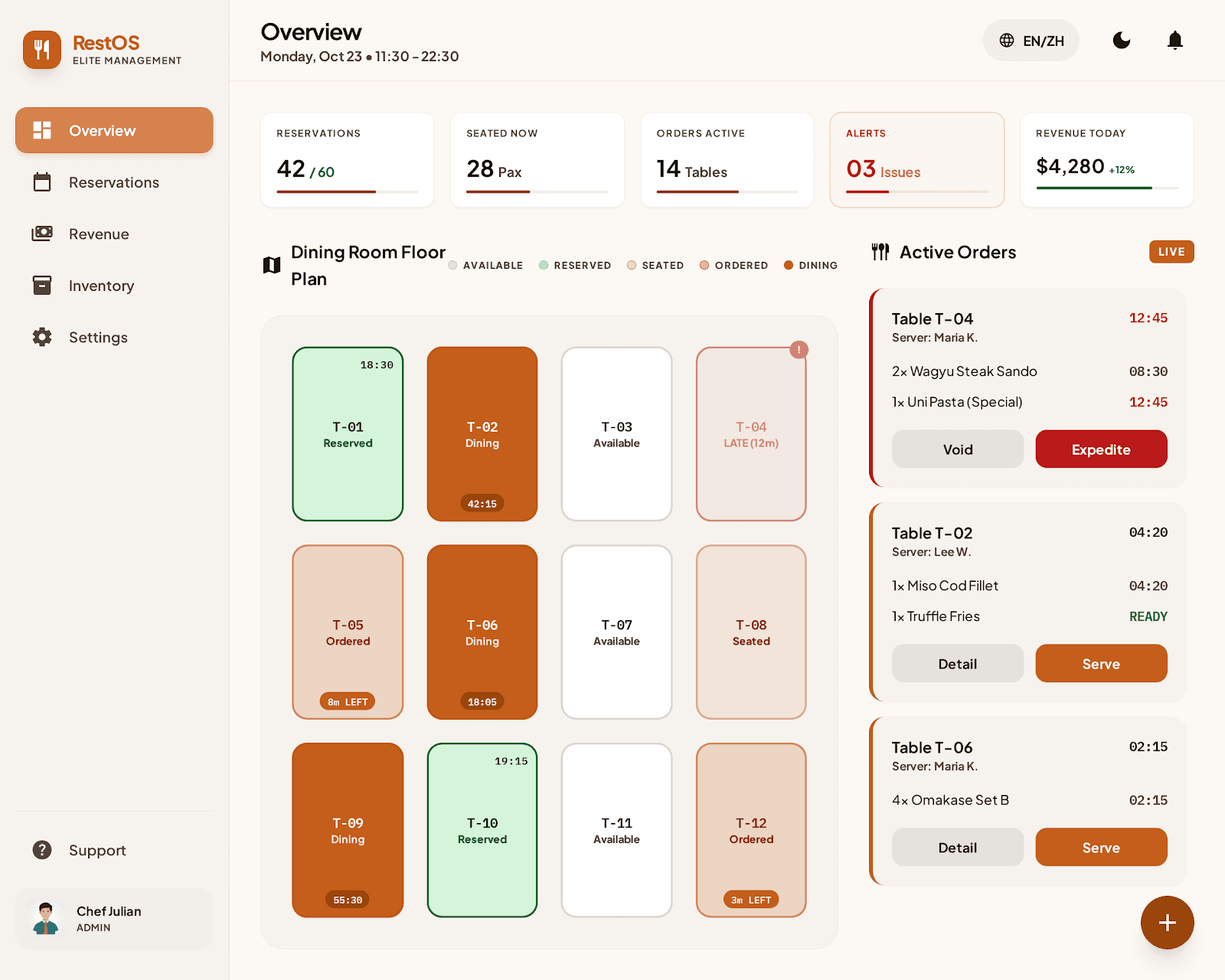 - Reservation Overview Dashboard: View real-time reservation status, including booked, available, and occupied seats in a centralized overview. - Walk-in Seat Assignment: Assign seats to walk-in customers based on current availability and update the status to “Seated” instantly. - Real-Time Order Visibility: Display order details in the overview once customers submitted, allowing staff to monitor all active orders at a glance. - Order Status Tracking: Track each dish with clear status indicators such as “Ordered” or “Dining,” along with waiting time for each item. - Delay Alert System: Highlight orders that exceed a 10-minute waiting time with warning indicators to help staff take immediate action.