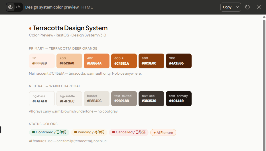 Create a new design system with a warm yet structured visual style. Use Claude to generate design tokens and translate them into Stitch (UI generation) and MagicPath (CSS output). ## Color Palette Background layers: --bg-base: #FAFAF8 (main background) --bg-surface: #F7F4EF (card / panel) --bg-elevated: #F2EDE4 (hover, modals) --bg-overlay: #EDE8DF (secondary panels) Primary accent: #C45E1A … ## Typography UI / Body: "DM Sans" or "Outfit" — clean, functional, readable at small sizes Monospace (data): "JetBrains Mono" — for numbers, IDs, timestamps Scale: --text-xs: 12px --text-sm: 13px --text-base: 15px --text-lg: 18px --text-xl: 24px --text-2xl: 32px --text-hero: 48px … ## Spacing & Layout … ## Component Rules …