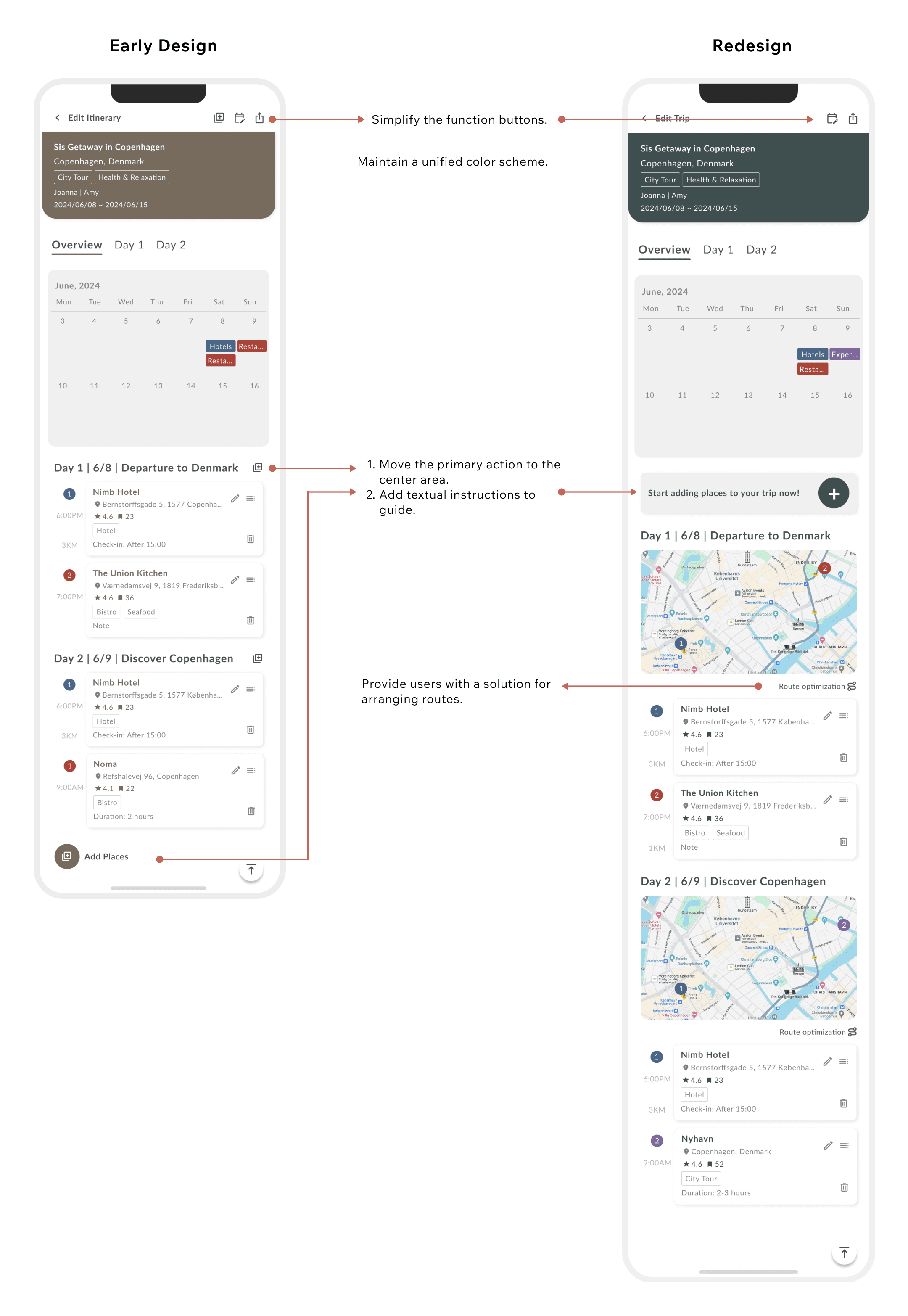 Based on user testing feedback, users did not utilize the buttons at the top and found the buttons at the bottom confusing. Additionally, they expressed concern about the buttons near the dates, fearing they might impact the already scheduled itinerary.