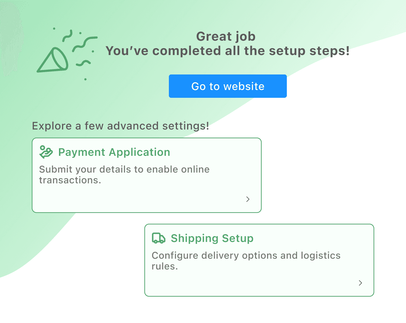 The design not only guides users through four key setup steps but also rewards completion. A confetti animation creates a moment of satisfaction and closure. Direct shortcuts connect users to the live site and related settings. This smooth transition keeps their momentum and encourages continuous use.